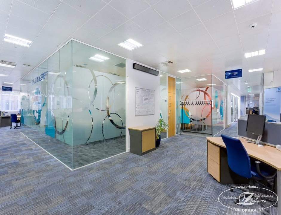 Широко применяется матовое стекло и в оформлении офисов. Из него получаются стеклянные перегородки в рабочих кабинетах для нескольких сотрудников. Такое решение позволяет изолировать рабочее место каждого, повышая концентрацию и сосредоточенность на выполнении работы.