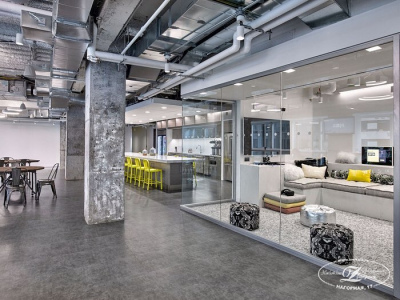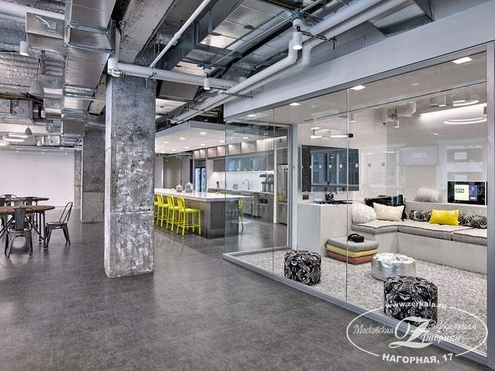 Бескаркасные перегородки и лестницы из осветленного стекла снижают «визуальный шум» и создают плавно перетекающее единое пространство помещения. Комната «очищается» от темных зон и наполняется живым светом.