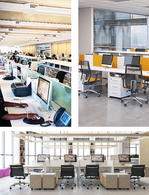 Популярный вариант оформления офисных помещений – open space («открытое пространство») предполагает отсутствие разделения на кабинеты и переговорные. Для комфортной совместной работы персонала в офисе устанавливаются перегородки для столов.